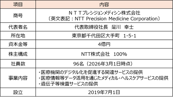 NTTプレシジョンメディシン株式会社は、 NTTグループの強みである高度なICT技術とデータ分析力を活かし、一人ひとりに最適な医療を提供する「プレシジョン・メディシン *1」の普及をめざし、生活者・患者起点の情報に基づく個人に最適化した予防・医療の実現、医療機関の業務DX化、生活者・個人データ、医療機関からのRWDを活かした予防・治療法の臨床研究、研究開発の支援を行っています。