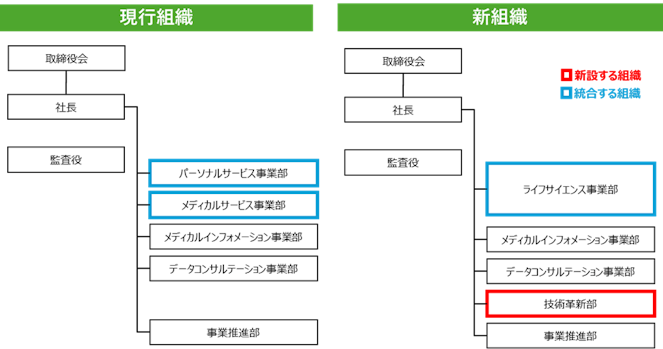 また、ナレッジやノウハウの相互活用による付加価値創出や効率的な組織運営による生産性向上を目的に、「パーソナルサービス事業部」と「メディカルサービス事業部」の「ライフサイエンス事業部」への統合を実施します。