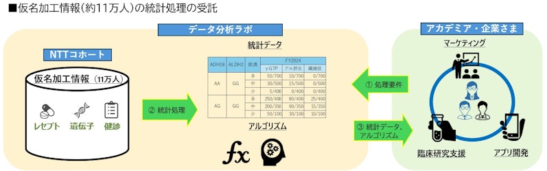 NTTコホートの新たなデータセットをもとに、研究機関さまや企業さまのご要望に応じ、仮名加工情報を統計処理し、その結果(統計データ、アルゴリズムなど)を提供します。