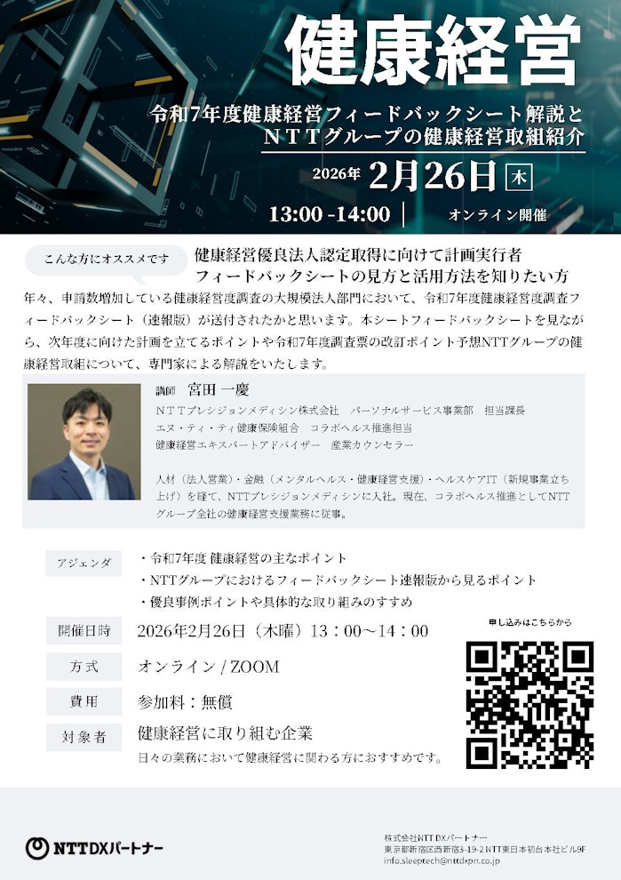 本セミナーでは、令和7年度の健康経営度調査を踏まえ、フィードバックシートの読み解き方や、NTTグループにおける健康経営の具体的な取組事例について解説いたします。